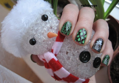 Na pierwszy ogień poszedł wzór choinek w towarzystwie bałwanka. Wzór aż się prosi o pomalowanie, ale póki co, to nie po drodze mi z robieniem stemplowych naklejek. Choinki odbiłam lakierem BLP/CA B. a Green Light.